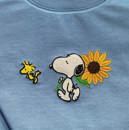 Sudadera unisex en color azul con bordado frontal del personaje Snoopy acompañado de Woodstock y un girasol. La prenda está confeccionada en algodón suave, ideal para uso casual, con un acabado limpio y resistente al uso y lavado. La sudadera cuenta con cuello redondo, costuras reforzadas y un ajuste relajado, lo que la hace adecuada para personas de cualquier género.